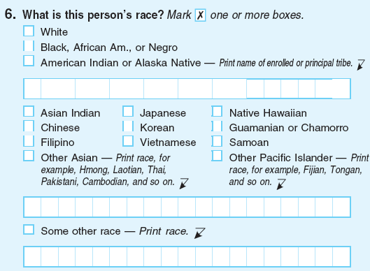 census-race-qMy mom was born and raised in the Philippines, and my dad is white (of Irish and Swedish heritage). When I fill out a form and come to the race question, I usually check “Other.” My siblings and I run the gamut of varying shades on the ethnic-looking scale from “white-ish” to “definitely mixed something-or-other, but can’t tell what exactly.” In person, I’ve been mistaken for: Latina, Hawaiian, Native American, Italian, and Inuit. A friend of mine once told me that I should be a model for stock photos on bank brochures–stick me in a wheelchair, and the art director can easily check off 5 different boxes of required representative diversity.